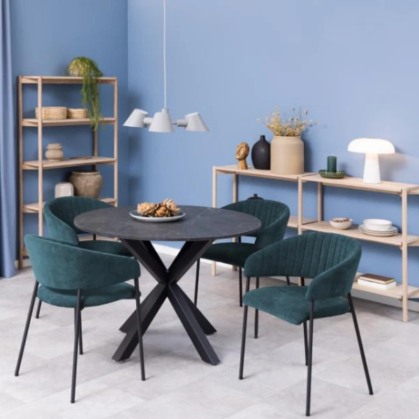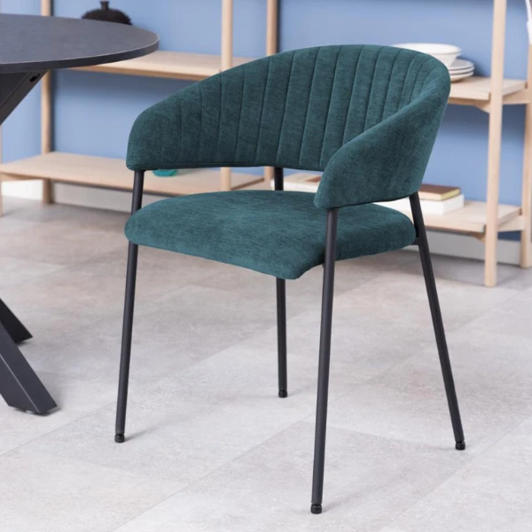 Armstoel Ann is voorzien van verticale stiksels en bekleed met donkerblauwe stof. Opgelet: Officieel is deze stof donkerblauw, maar in de realiteit is deze kleur eerder een mengeling van groen en blauw. Gelieve hiermee rekening te houden bij uw aankoop. De bekleding van deze stoel is scheur- en slijtvast en voelt zacht en warm aan. Het onderstel van de stoel bestaat uit 4 robuuste poten uit zwart gepoedercoat metaal.Â