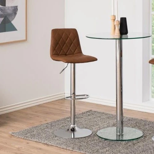 Een semi-traditionele barkruk die het beste van twee werelden brengt in hedendaagse woningen. De zitting is gevuld met polyurethaan en bekleed met zacht lederachtige stof in een warme bruine kleur krijgt. Hij wordt ondersteund door een verchroomde trompetpoot die niet alleen een praktische maar ook een moderne oplossing is die de traditionele formele look in evenwicht brengt. Harlekijn stiksels voegen een decoratieve flair toe.