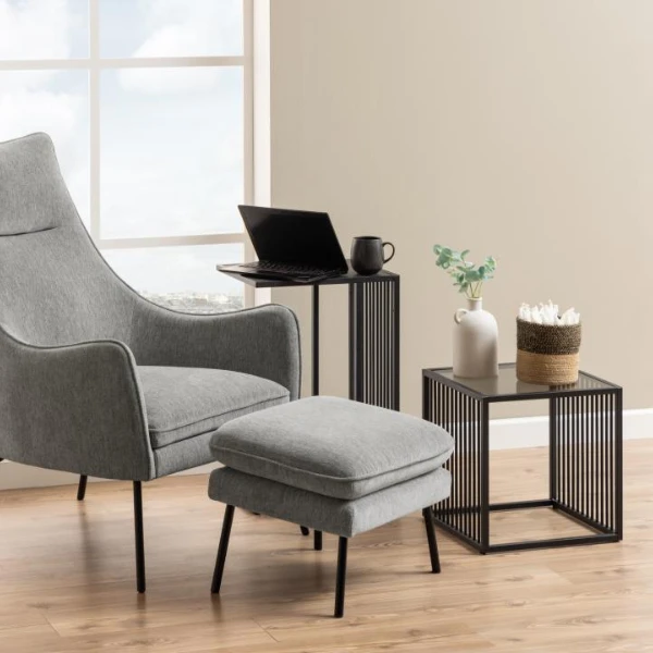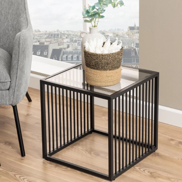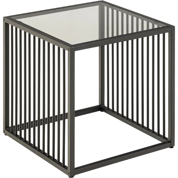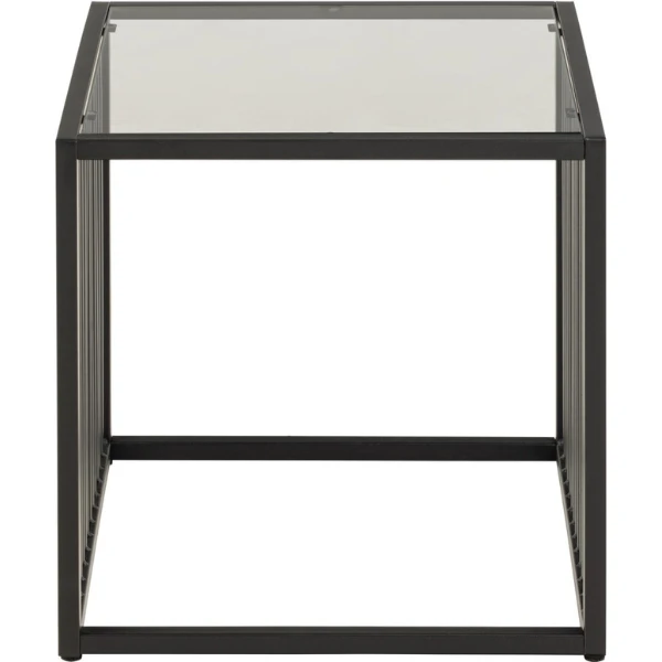 De vierkante/rechthoekige bijzettafel Strington is een stijlvolle en functionele toevoeging aan elke ruimte. Het bovenblad is gemaakt van hoogwaardig gerookt gehard glas en geeft elke ruimte een geraffineerde uitstraling. Het draadonderstel, gemaakt van matzwart ruw gepoedercoat staal, geeft de tafel een moderne en industriële uitstraling.