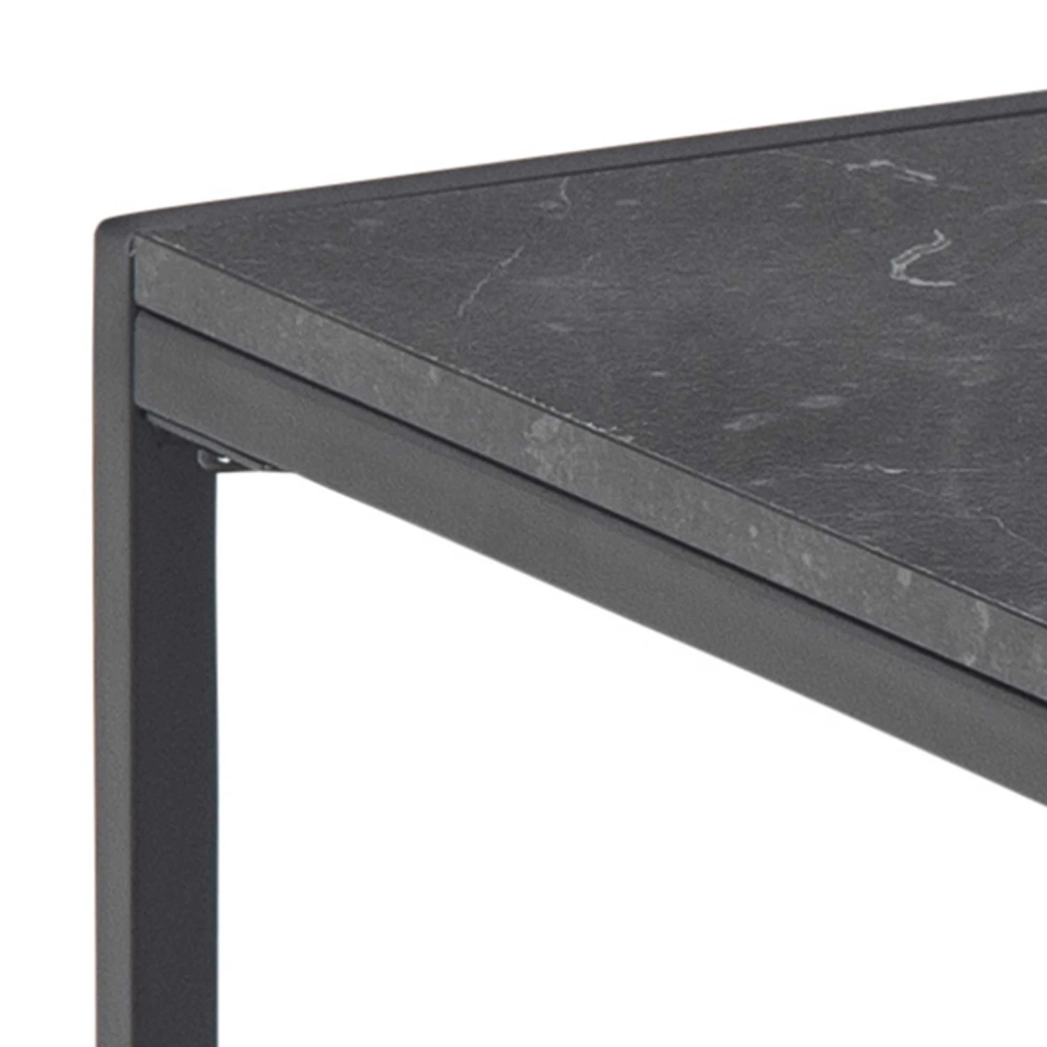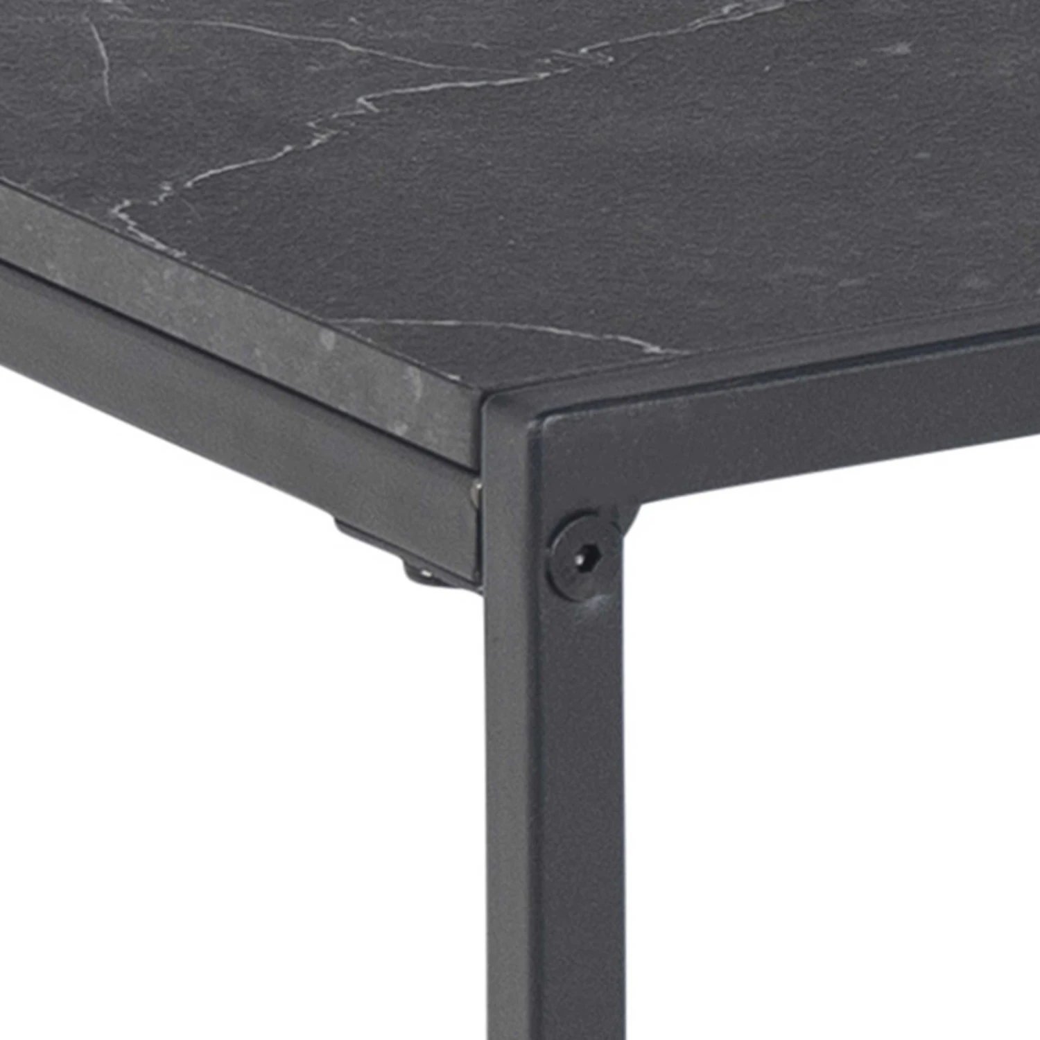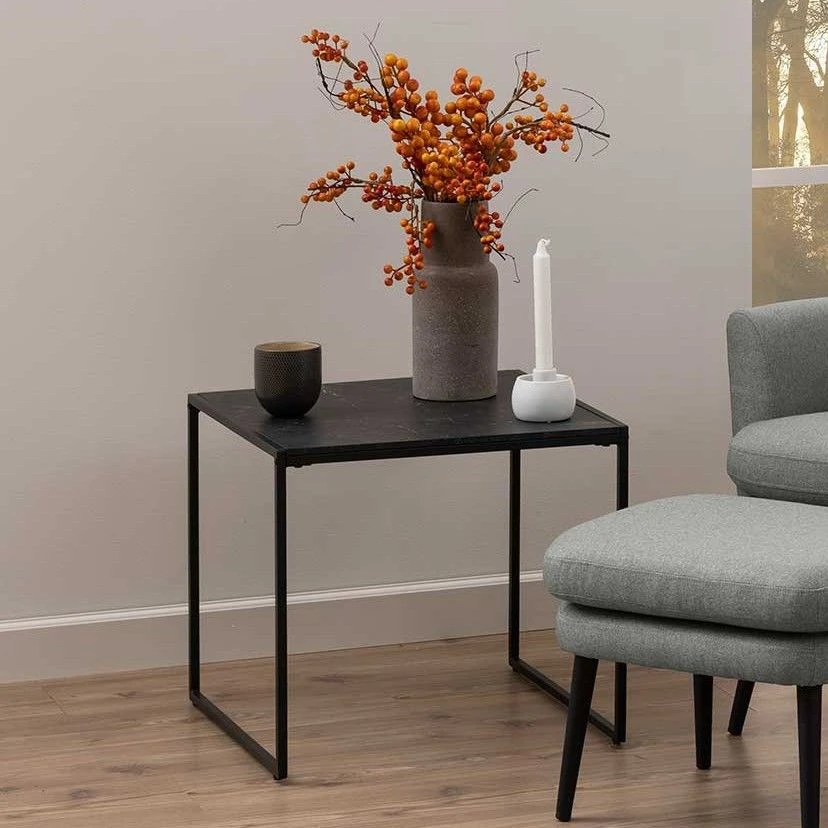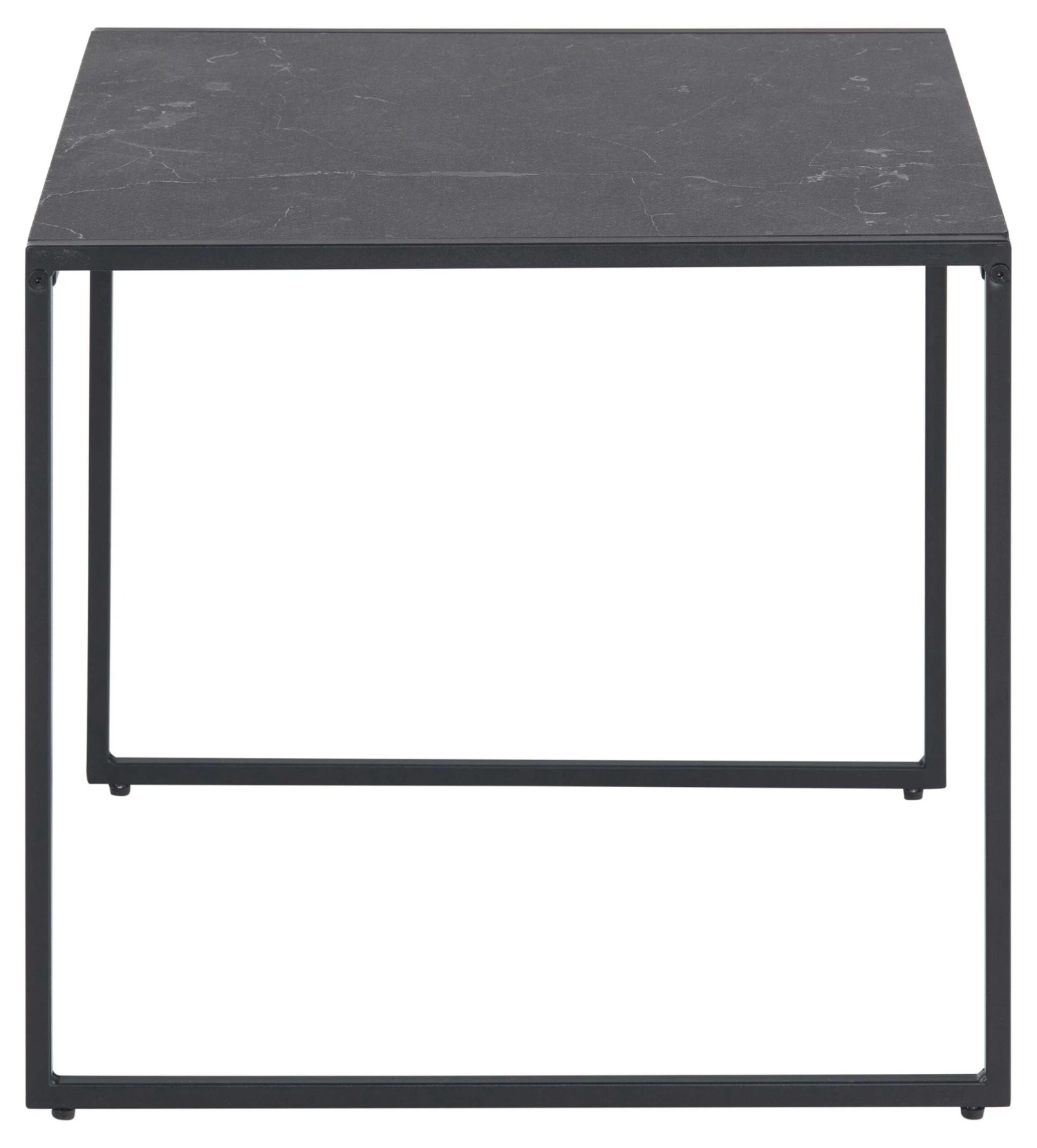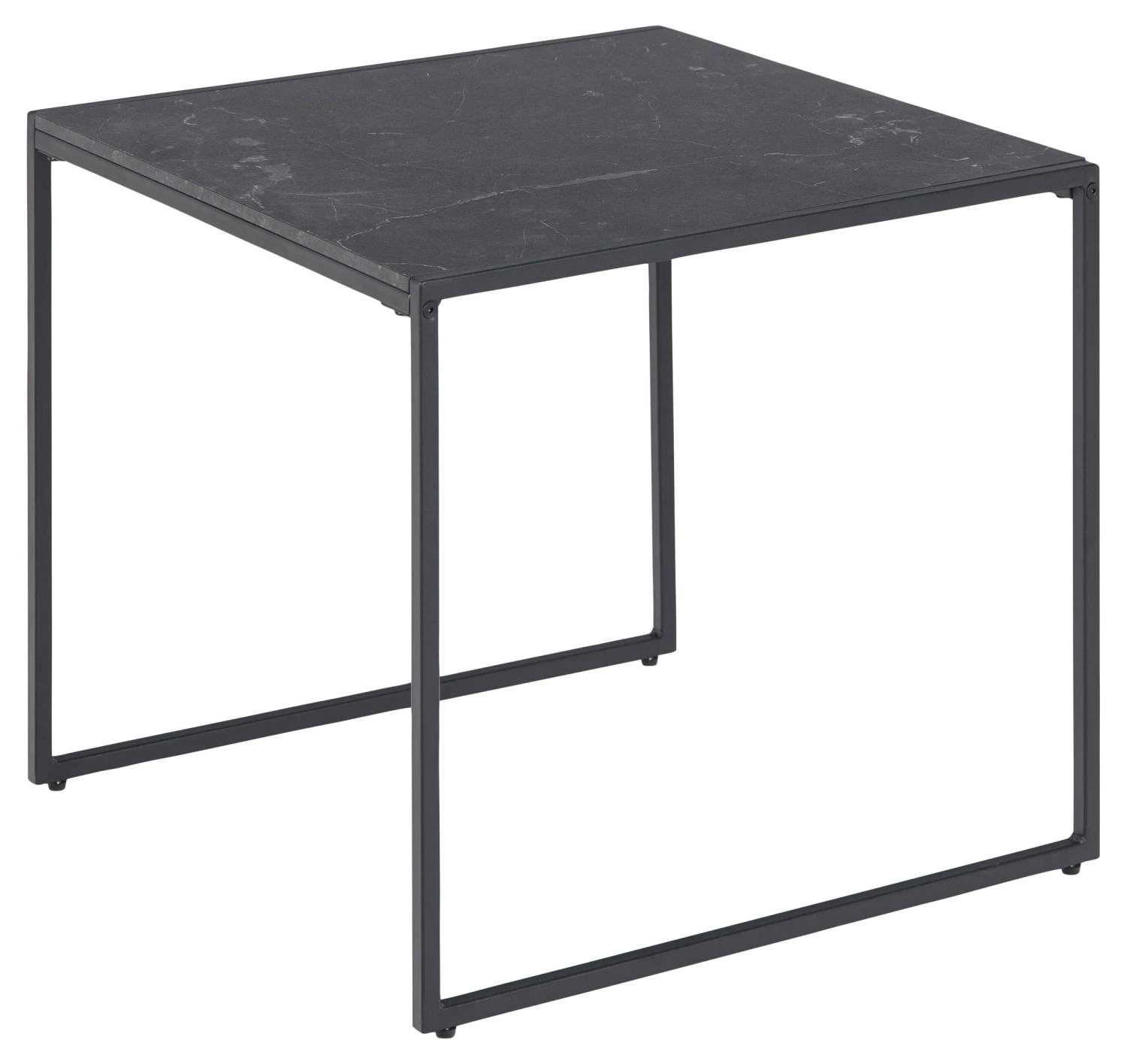 Vierkant bijzettafeltje Idris met tafelblad in marmerlook en matzwarte metalen poten.