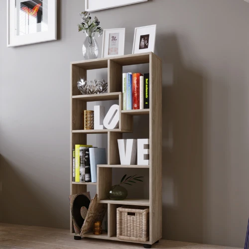 Door de vakken in verschillende groottes heeft boekenkast Azira een speelse uitstraling. Het zachte Sonoma eikdecor creëert een huiselijke sfeer in uw interieur. In de 8 vakken is plaats voor boeken en decoratie. Plaats deze boekenkast horizontaal of verticaal of hang hem op tegen de muur naargelang de look die u verkiest. Deze kast dient aan de muur vastgemaakt te worden, schroeven en pluggen hiervoor zijn inbegrepen. Deze kast is beschikbaar in verschillende uitvoeringen.