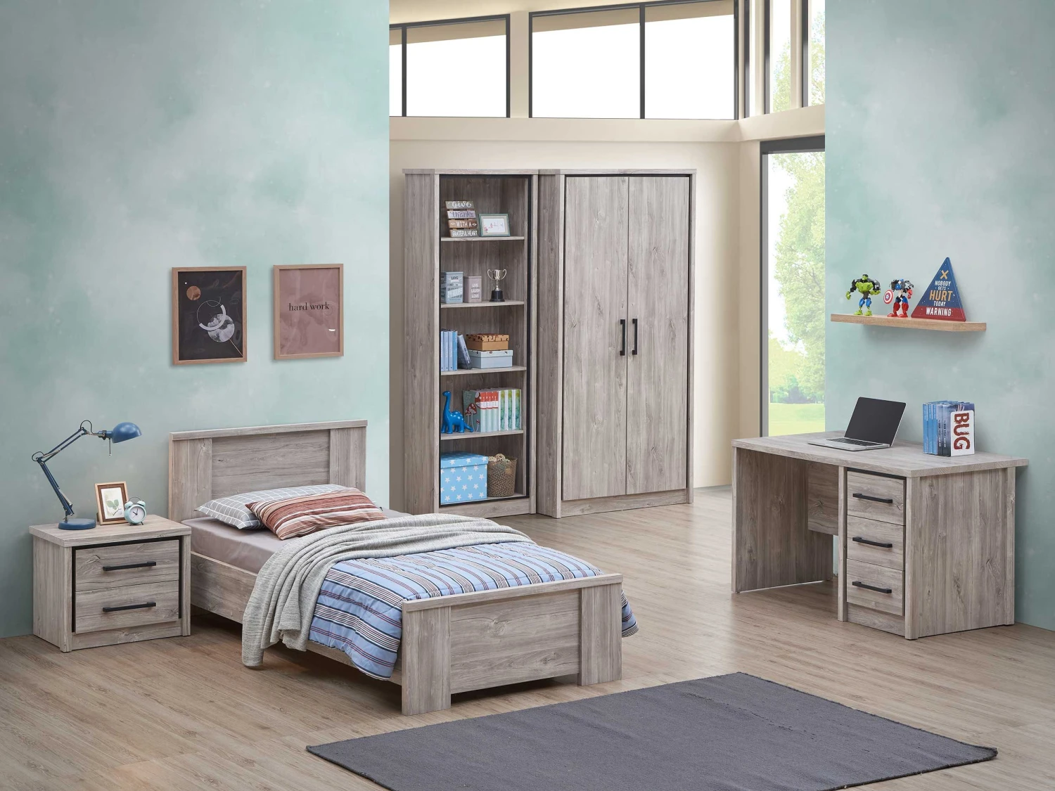 Richt jouw slaapkamer in met de Sela-meubelen, een moderne collectie slaapkamermeubelen met een warme uitstraling. De meubelen zijn gemaakt van spaanplaat met een decor van grijze eik. De zwarte lijnen en handvaten geven de meubelen een strakke look.