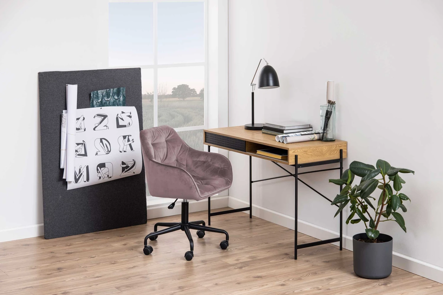 Bureaustoel Bridget met oudroze stoffen bekleding. Uitgerust met wieltjes, in hoogte verstelbaar.
