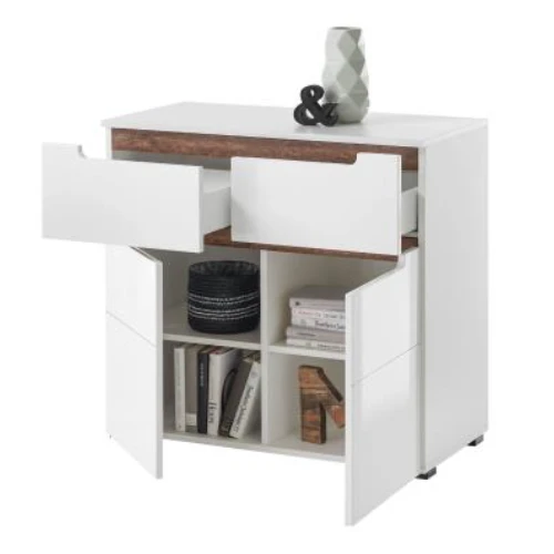 Opgeruimd staat netjes, daar zorgt de Nuro-collectie wel voor. De moderne meubelen zijn gemaakt uit MDF met een afwerking in hoogglans wit. Aan de handgrepen vind je een donker houten accent. Deze commode heeft bovenaan twee lades en daaronder twee draaideuren. De opbergruimte binnenin is verdeeld in vier vakken.Â