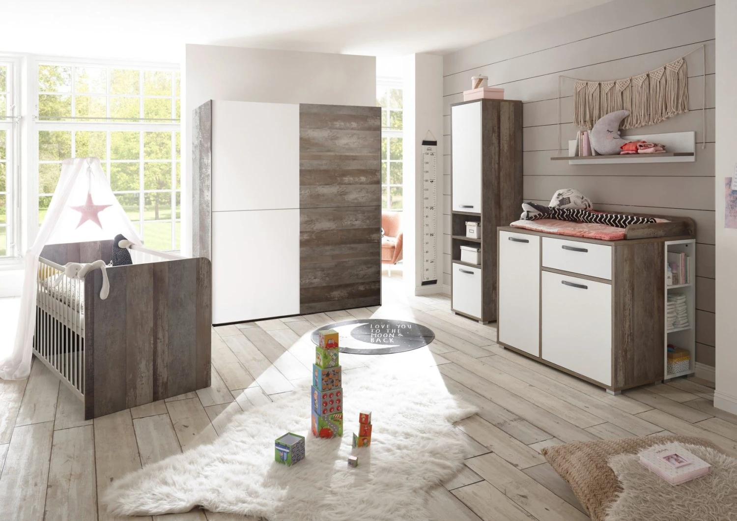 Praktische commode met 2 deuren, 1 schuiflade en 6 handige open opbergvakjes. Aan beide zijkanten van het meubel zijn er drie ingericht. Het meubel is gemaakt uit spaanplaat, hoofdzakelijk in een zacht en aangenaam decor van drijfhout, met fronten in wit. De handgrepen en voetjes van het meubel hebben een aluminiumlook. Dit moderne meubel past als gegoten in de kamer van je oogappel!Â