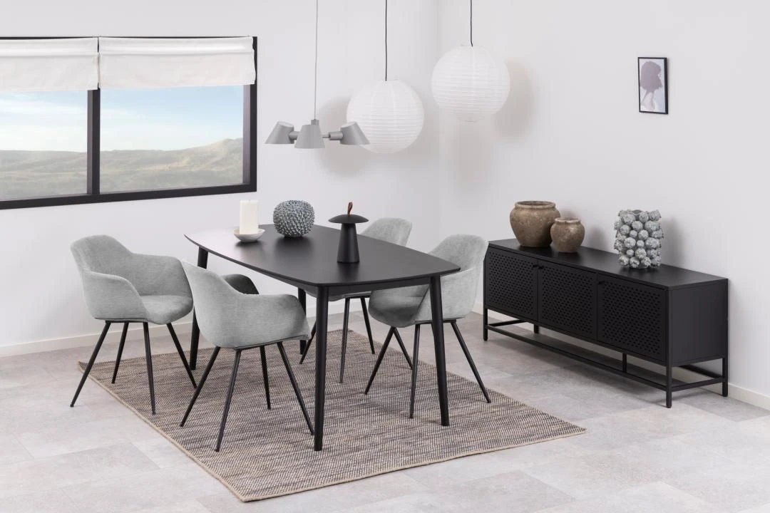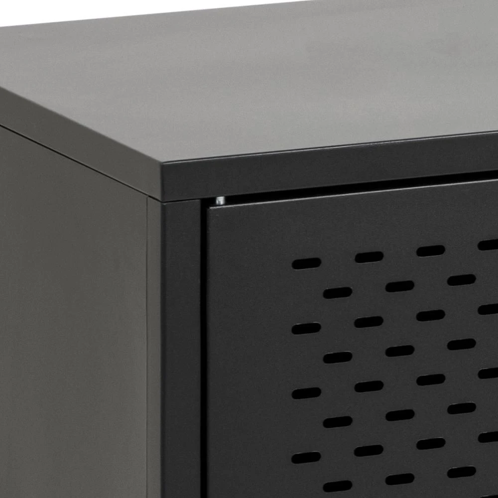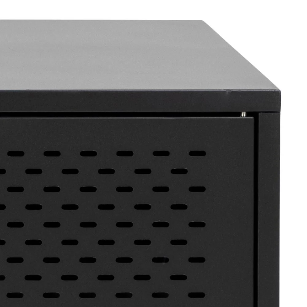 Breng een industriële sfeer in uw huis met het Nebas dressoir. Het zwart gepoedercoate metaal brengt een moderne sfeer in de kamer en het motief op de drie deuren maken de industriële look compleet. Gebruik het dressoir om je ruimte te upgraden en tegelijkertijd wat extra opbergruimte te creëren.