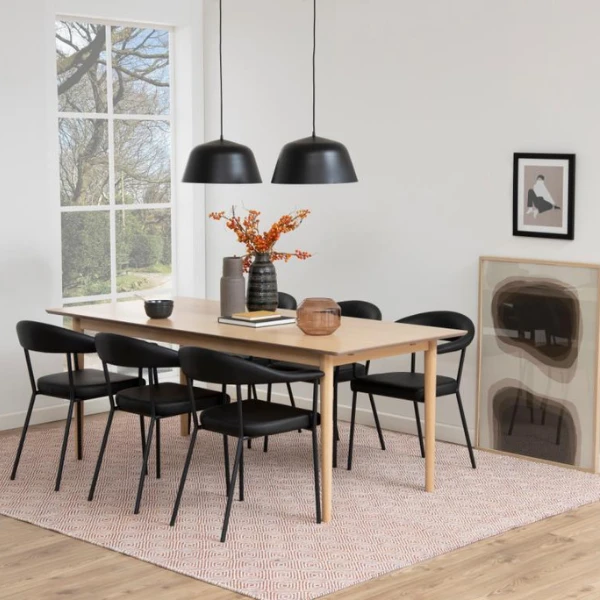 Deze moderne Hava eetkamerstoelen beschikken over een heel simplistisch design. Je kan ze gemakkelijk in een klassiek als modern interieur combineren. Deze stoelen hebben zwart gepodercoat metalen poten en een afgeronde rugleuning. De zitting is gevuld met polyurethaan en bekleed met zwarte kunstleer.Â