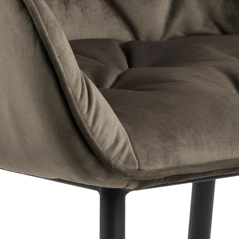 Deze gestoffeerde Lynn stoel met armleuningen is bekleed met taupekleurig fluweel en geeft een chique en luxueuze uitstraling aan je eetkamer. Tegelijk zorgen de mat zwarte poten uit gepoedercoat metaal voor een stoere toets. De armstoel is beschikbaar in verschillende trendy kleuren. Het ergonomische ontwerp met armleuningen en de zachte zitting zorgen voor een optimaal zitcomfort. De stoelen Lynn zijn beschikbaar in verschillende kleuren en uitvoeringen. Vind je favoriet op onze website.Â
