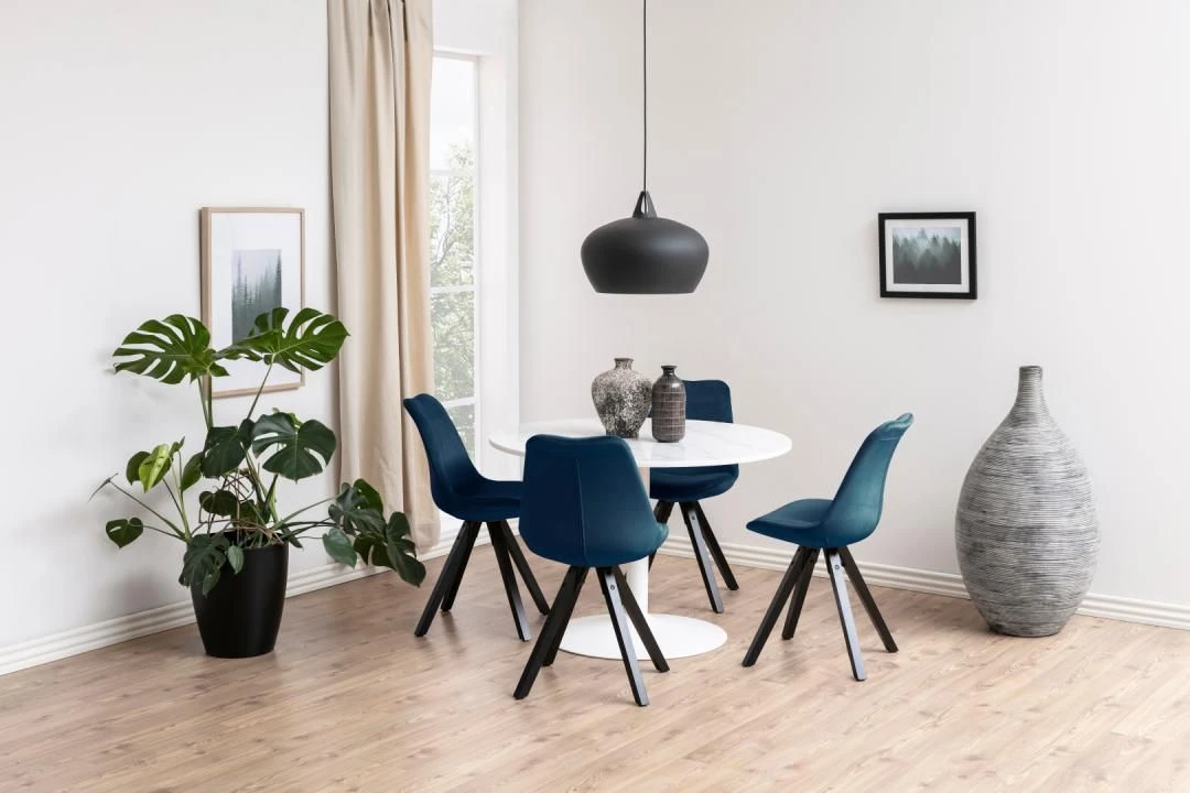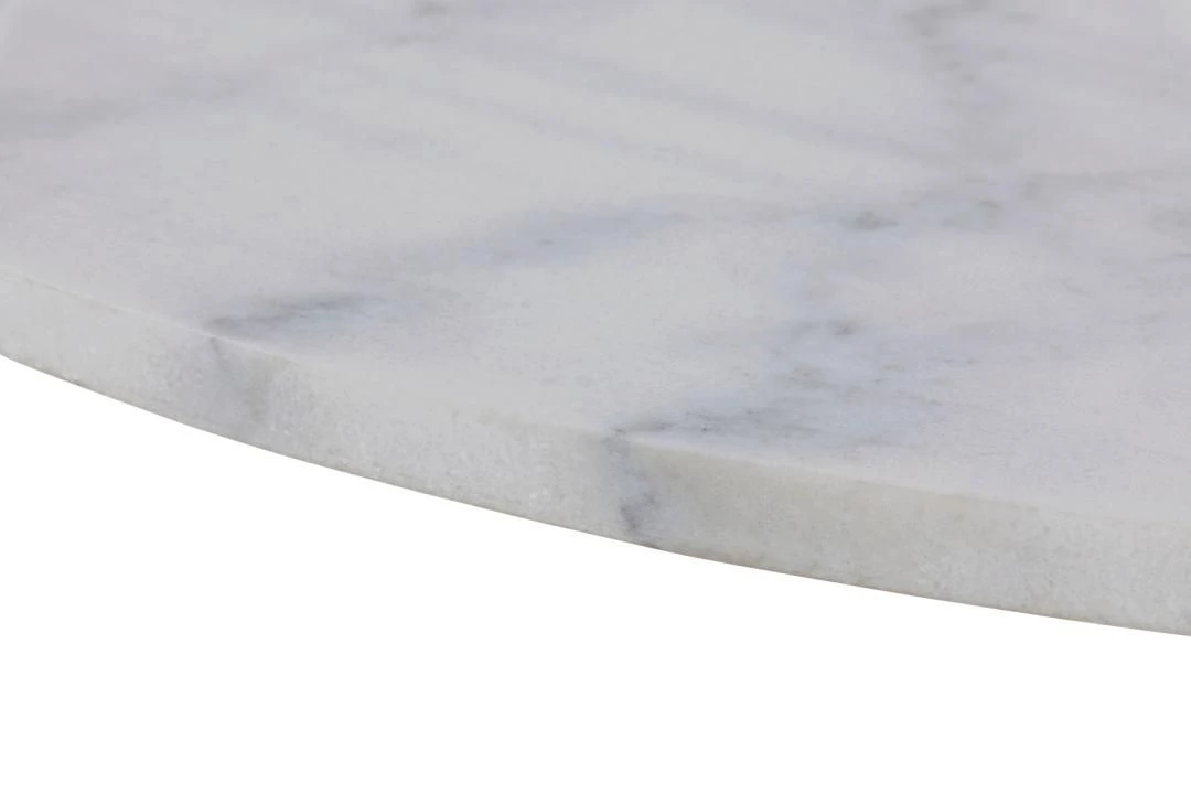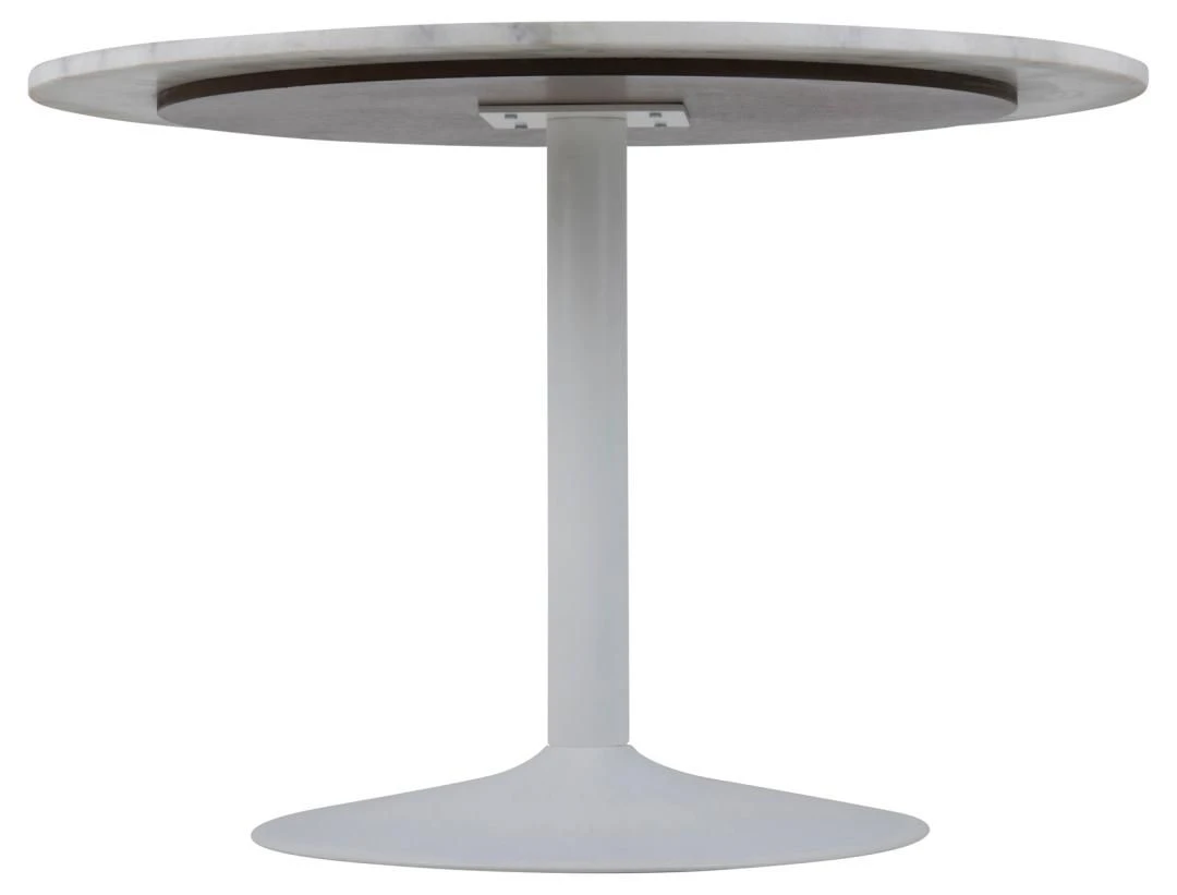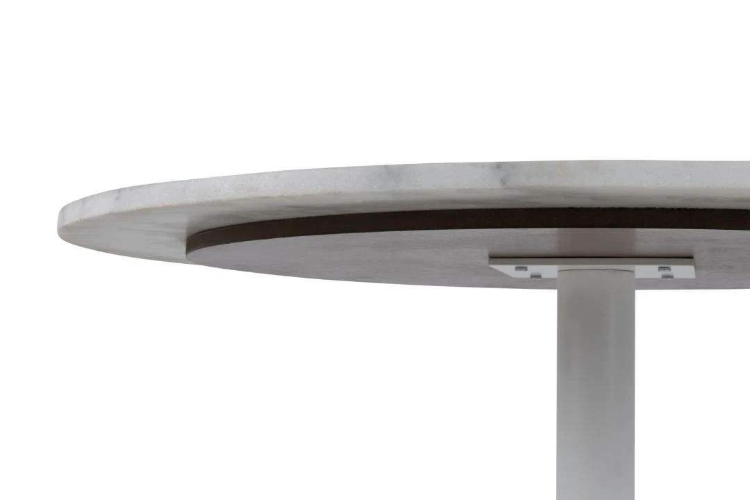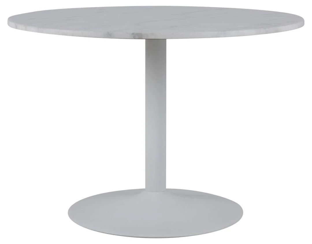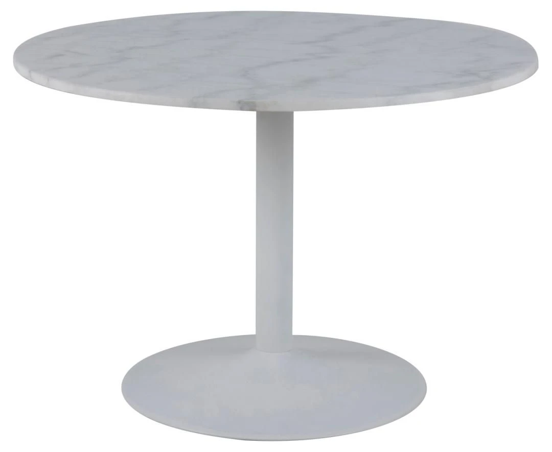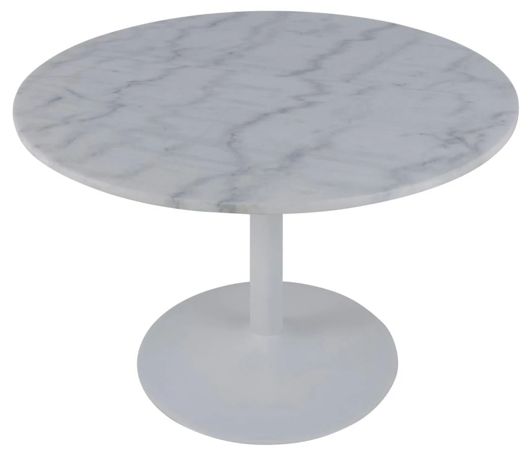 Eettafel Tarro, beschikt over een diameter van 110 cm. Gemaakt uit metaal met een afwerking van witte poedercoating en een tafelblad uit witte Guangxi marmer.