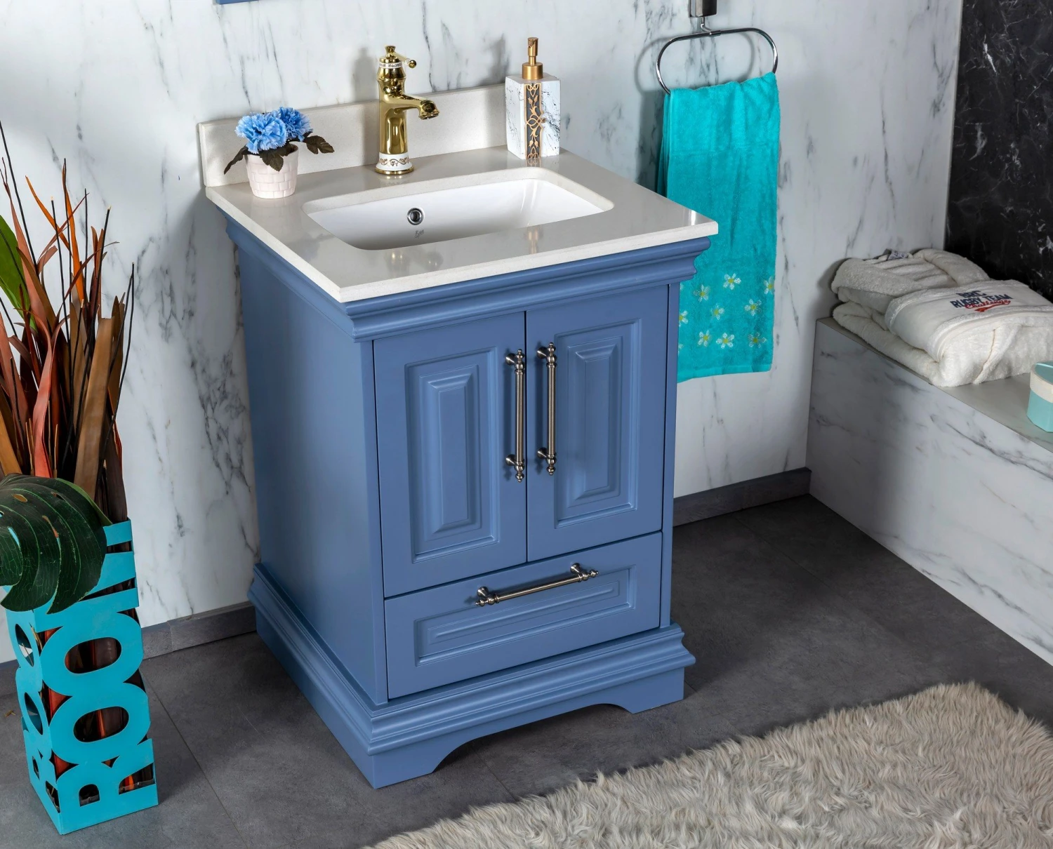 Jussara badkamermeubelset bestaat uit een badmeubel met een wit kwarts aanrechtblad, porseleinen onderbouwwastafel, bronzen handgrepen en een blauwe flotal spiegel.