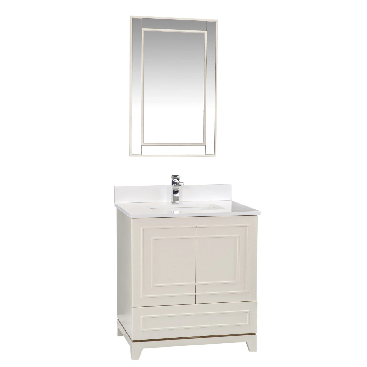 Jussara badkamermeubelset – 2 stuks. Gemaakt van 100% massief hout en voorzien van een wit kwarts aanrechtblad, porseleinen wastafel en flotale spiegel. Crème kleur