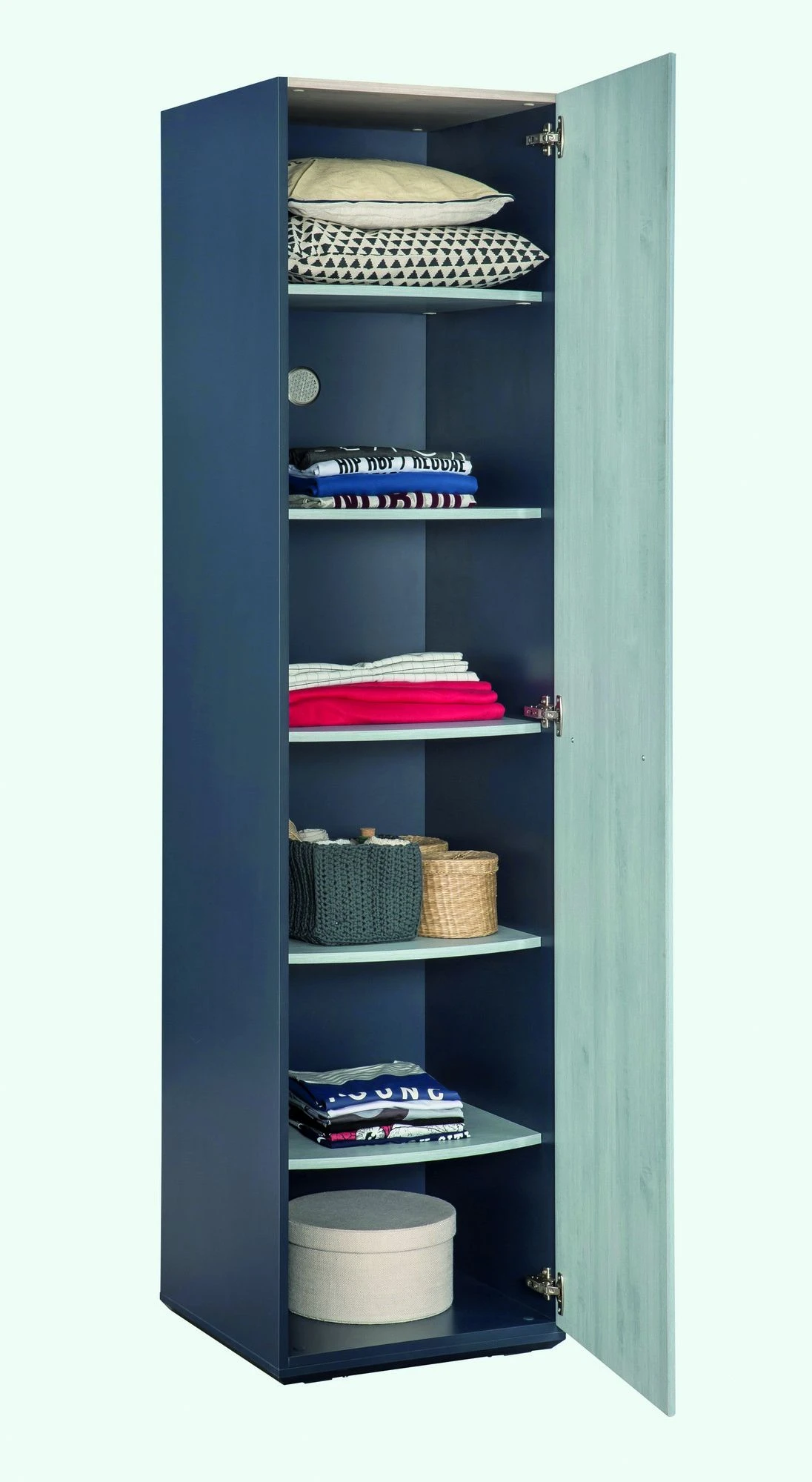 De kledingkast komt ook uit de Trio-serie, wat betekent dat hij verkrijgbaar is in een levendige en opvallende veelkleurige optie. Hiermee kun je een vleugje kleur en persoonlijkheid aan je woonruimte toevoegen, waardoor deze echt van jou wordt.