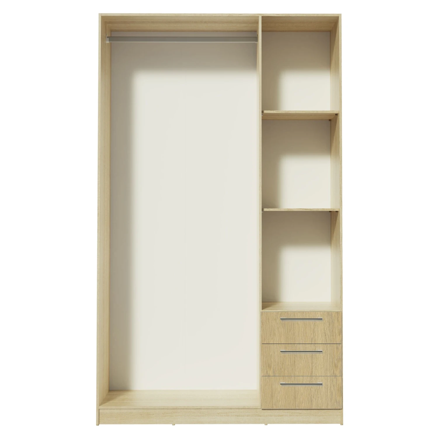 Voor een georganiseerde en aangename kamerindeling zit je bij de Tarn-kast vast en zeker goed. De kast is gemaakt uit spaanplaat in eikdecor en biedt je verschillende opbergmogelijkheden. Er zijn twee grote deuren en één kleinere deur, met onder die kleine deur nog drie opberglades. Achter de twee grootste deuren is bovendien een handige kledingstang voorzien, terwijl er achter de kleinere deur twee ruime legplanken schuilen. Zo kan je al je kledij en accessoires, met verschillende volumes, gemakkelijk kwijt in dit meubel.