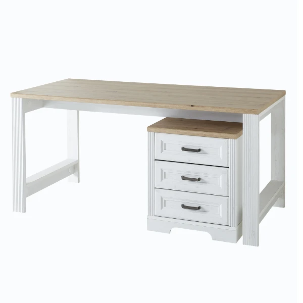 Ga voor de modern landelijke woonstijl met de meubelen van de Samine-reeks, die zijn gemaakt uit spaanplaat in wit en met afwerkingen in eikdecor. De reeks bestaat ook in grafietkleur. Dit ladeblok past perfect onder het bureau Samine. Dankzij de drie lades kan je al je kantoorbenodigdheden netjes opbergen. Geniet van de opbergruimte met soft-close systeem en metalen handgrepen. Ontdek de volledige collectie Samine op onze website.Â