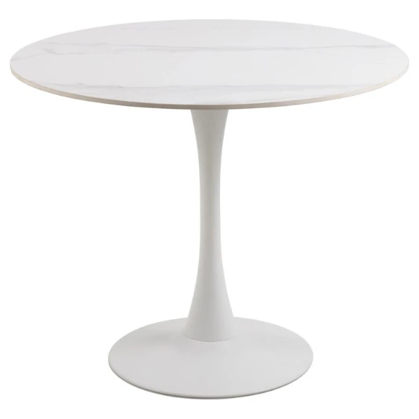 Het trompetonderstel is gemaakt van wit ruw gepoedercoat staal, wat zorgt voor stabiliteit en duurzaamheid. Met zijn afmetingen van 90×75 cm biedt deze tafel comfortabel plaats aan maximaal vier personen, waardoor hij ideaal is voor kleine bijeenkomsten en intieme diners.