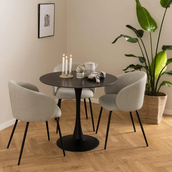 Met een diameter van 90cm en een hoogte van 75cm biedt deze eettafel het perfecte oppervlak voor het houden van intieme bijeenkomsten of het genieten van maaltijden met familie en vrienden. De ronde vorm stimuleert conversatie en een gevoel van samenhorigheid, zodat iedereen zich erbij betrokken voelt.