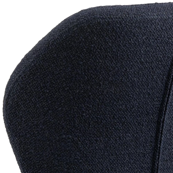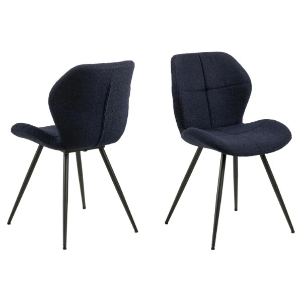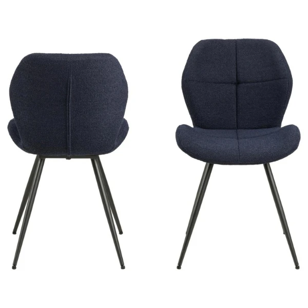 Eetkamerstoel Petri bestaat uit donkerblauwe Monza stof, zwart stalen onderstel, vierkante stiksels en een ritssluiting.Â