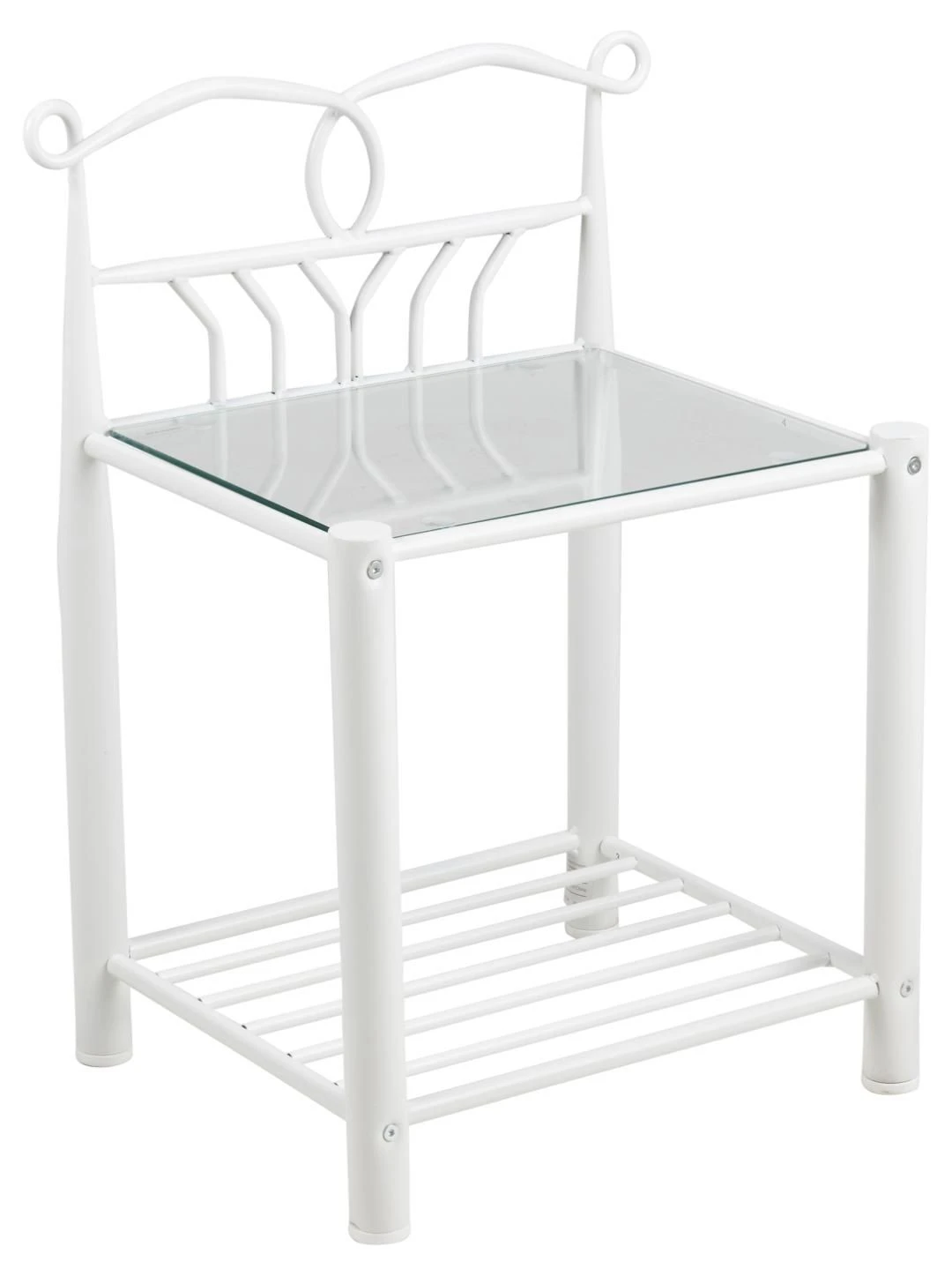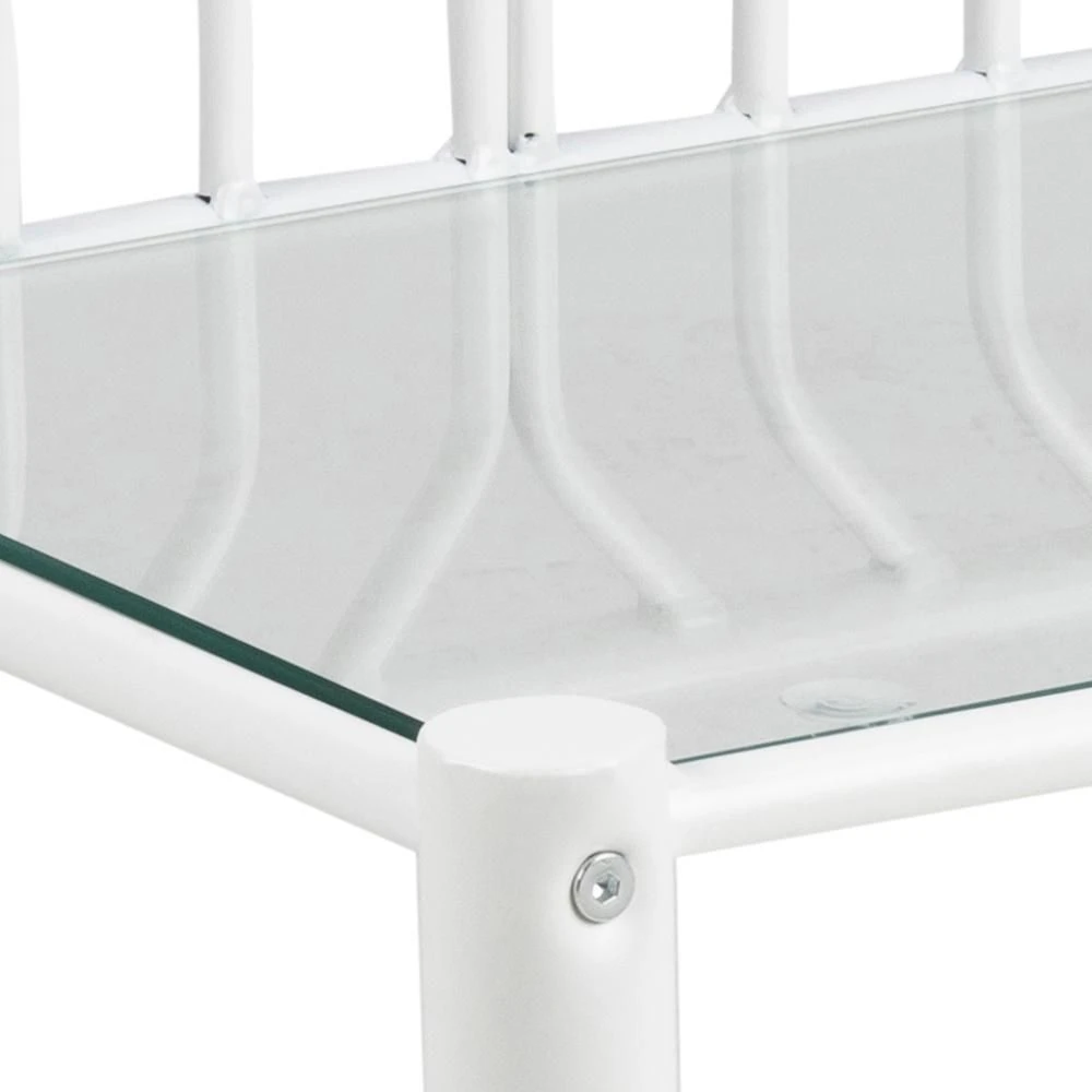 Nachtkastje Laila, gemaakt uit metaal afgewerkt met witte poedercoating en een tafelblad uit glas.