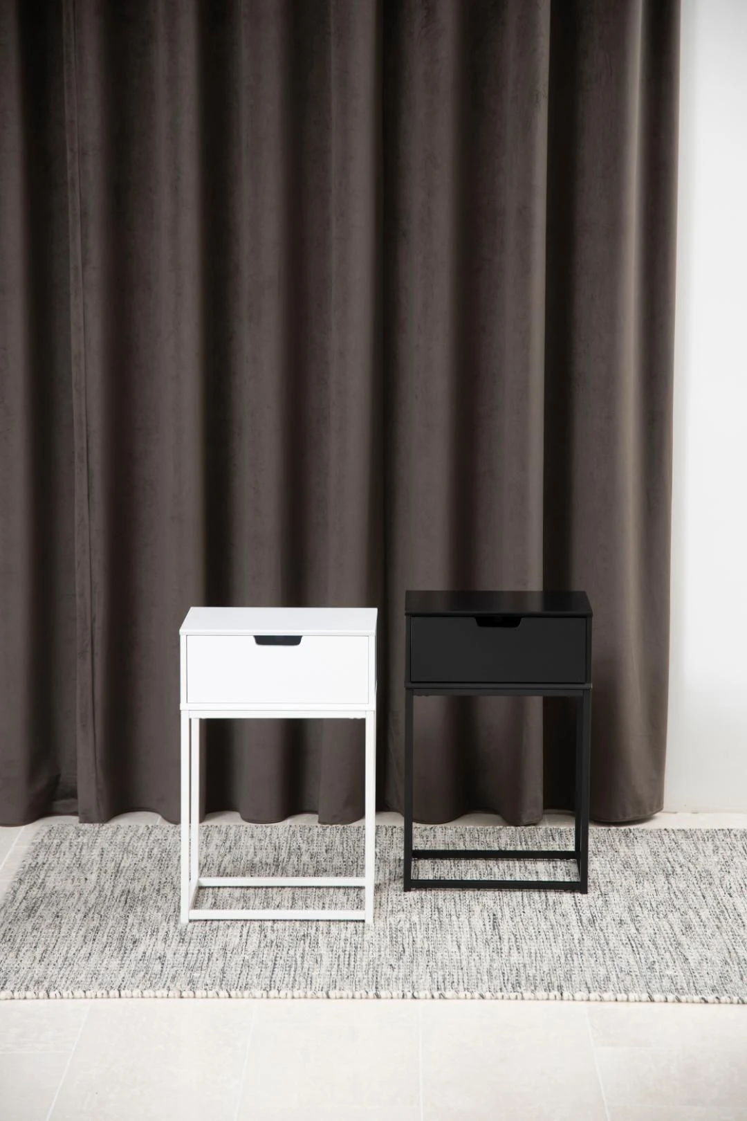 Nachtkastje Mistra, uitgerust met 1 lade. Gemaakt uit MDF en metaal afgewerkt met zwarte poedercoating.