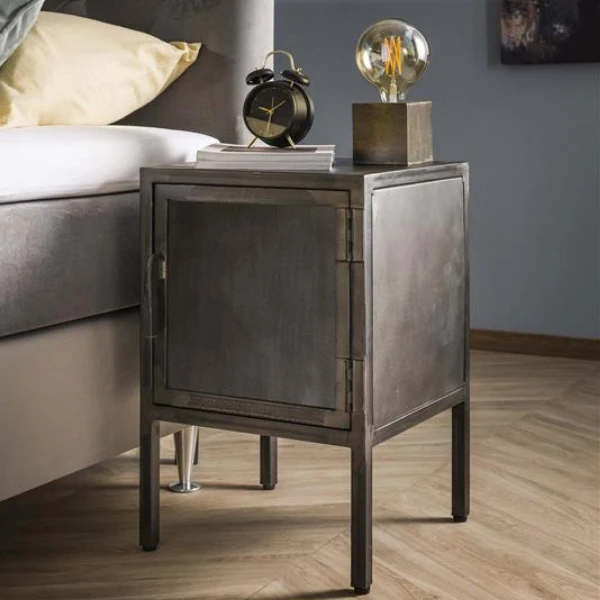 Voor fans van de industriële woonstijl is de collectie Raft Metal een echte aanrader. Dit nachttafeltje 40x40x60cm is gemaakt uit metaal met een gunmetal afwerking. Het strakke en stoere ontwerp en het verweerde metaal geven het nachttafeltje een robuuste uitstraling. De poten zijn voorzien van vloerbeschermers, zodat je geen krassen in je vloer maakt. Achter het deurtje is er voldoende ruimte om allerlei spullen op te bergen.