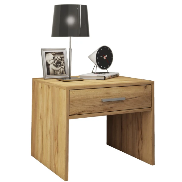 Nachttafeltje Javi is gemaakt uit gemelamineerde spaanplaat met wilde eikdecor en bestaat uit 1 lade.