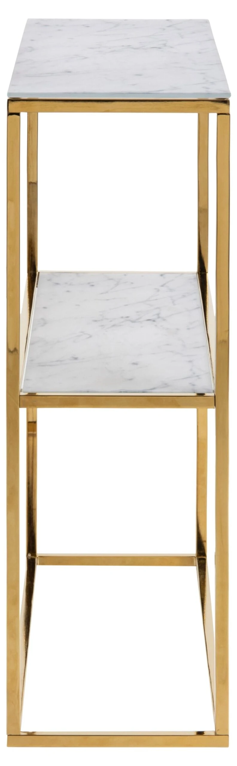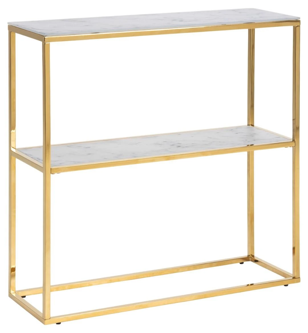 De Anika sidetable is ideaal om in de hal of de woonkamer te plaatsen. Deze sidetable is zeer praktisch dankzij haar extra legplankje. Je kan gemakkelijk een lampje, kaars of plant op het tafelblad plaatsen en boeken of magazines op het legplankje leggen. Deze sidetable is gemaakt uit kunstmarmer in het wit met gouden poten.