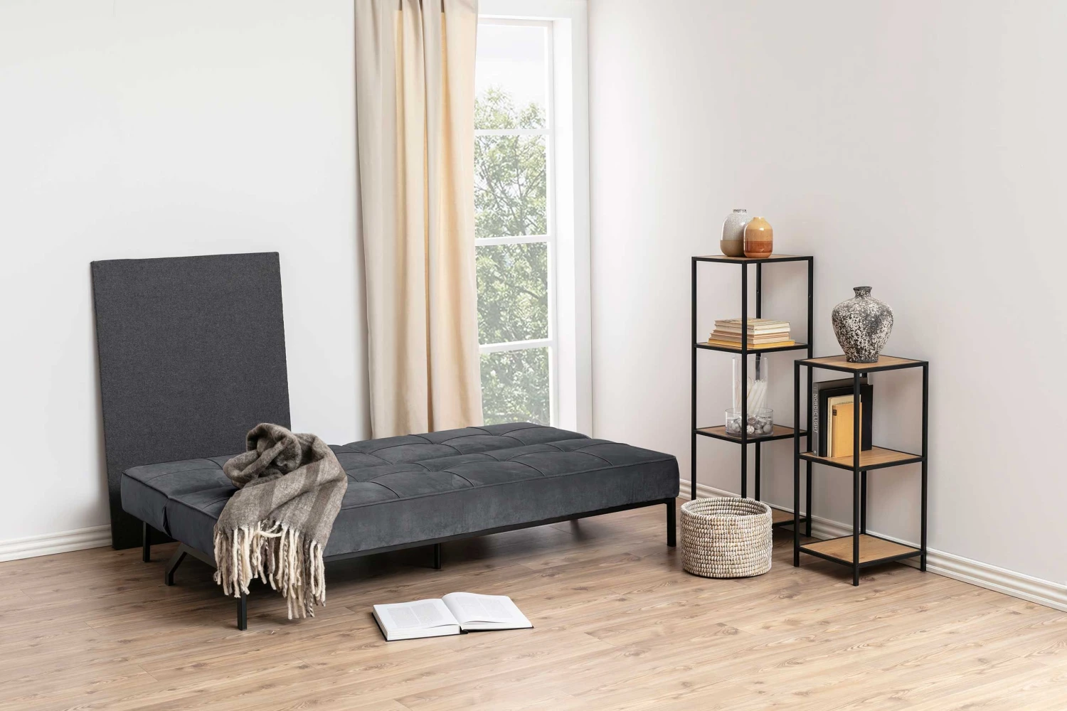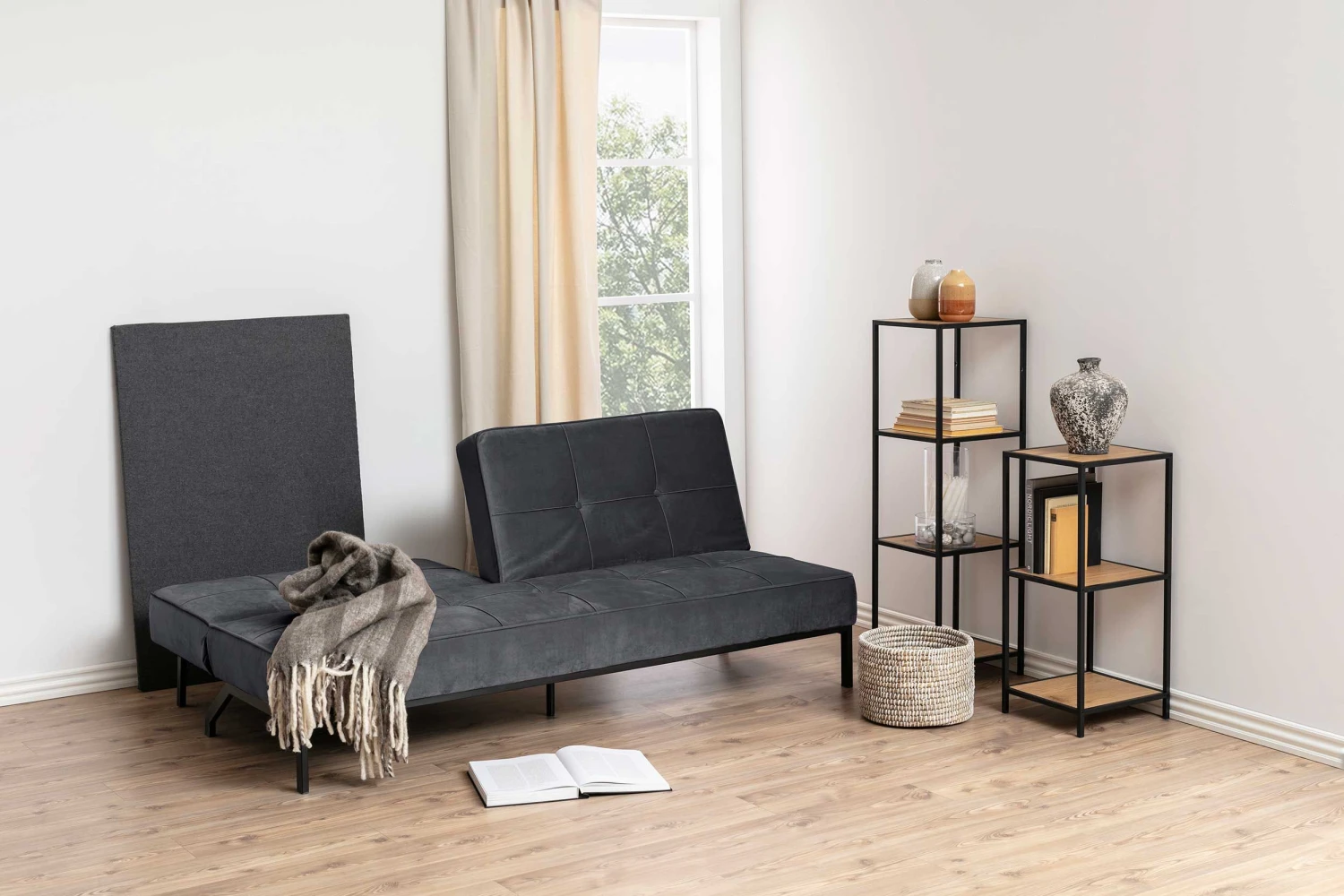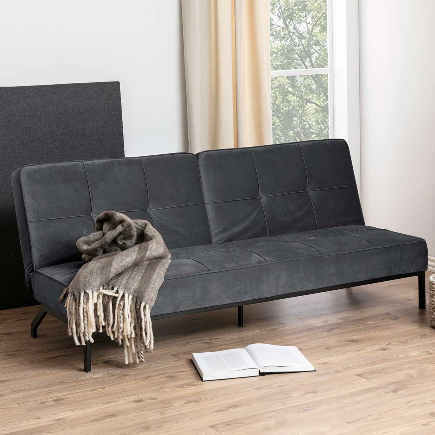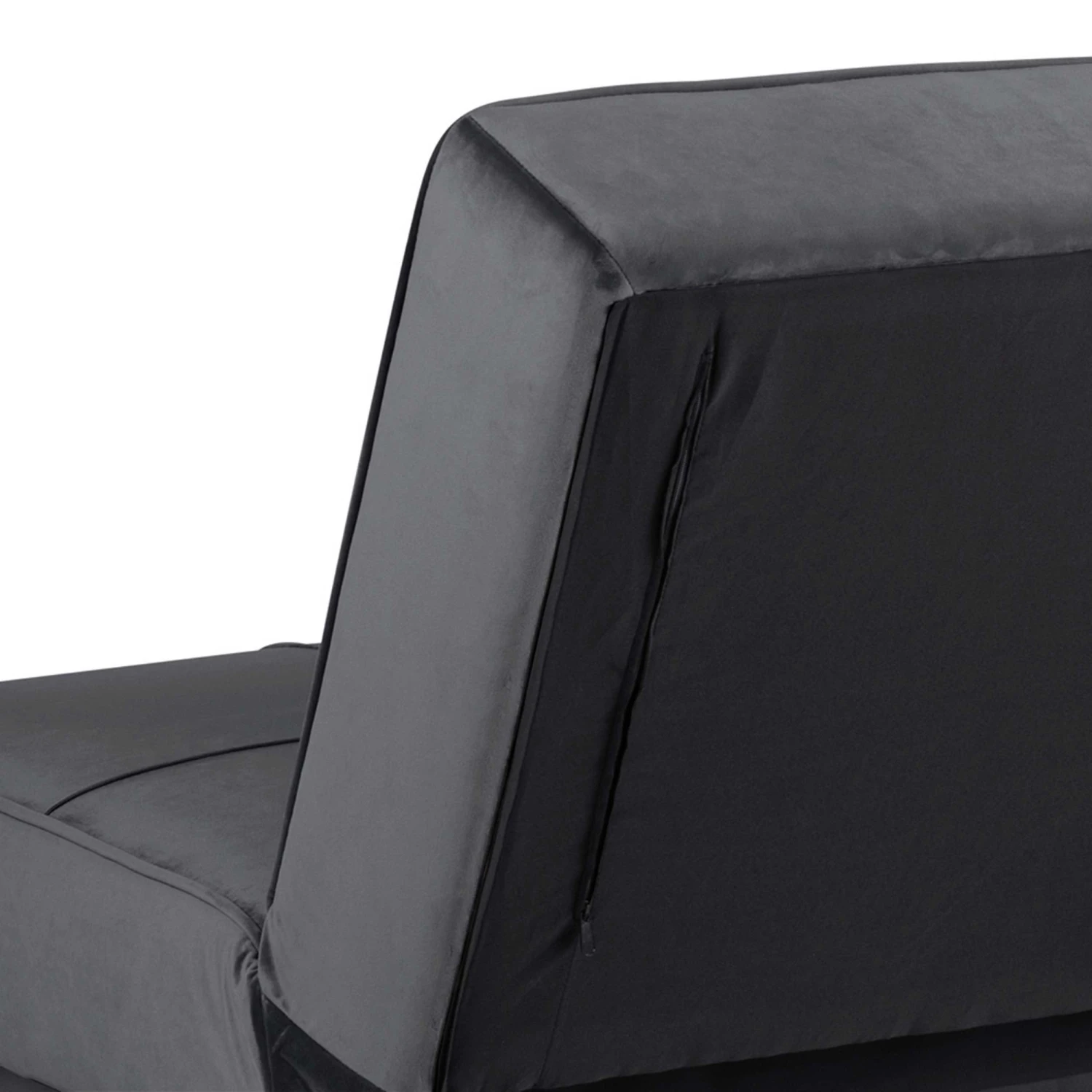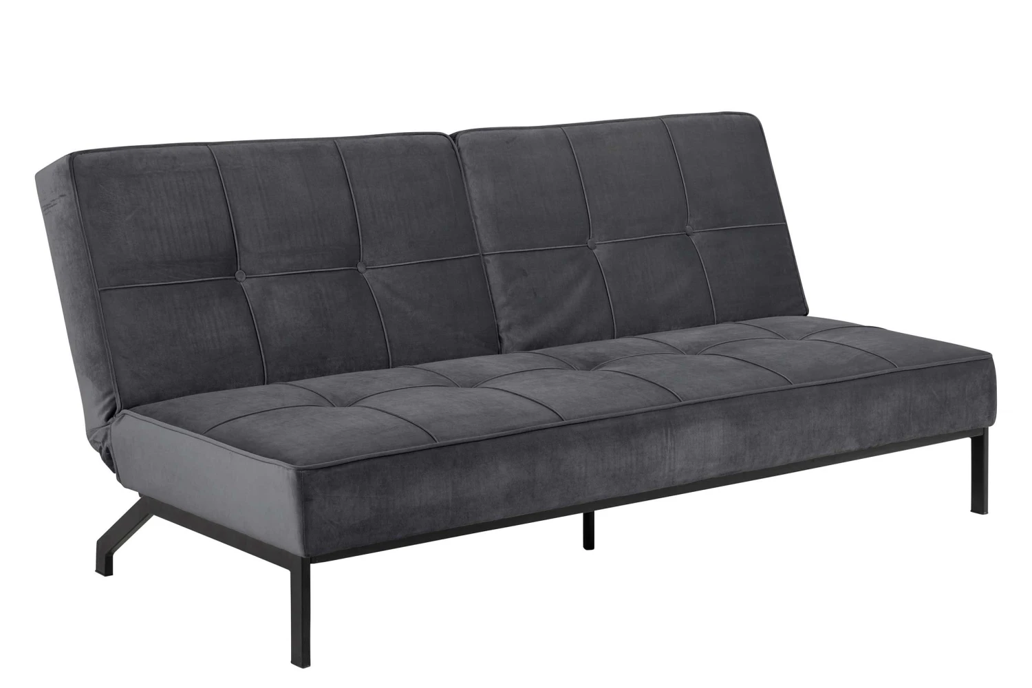 Slaapbank Giovanni met donkergrijze, fluwelen bekleding en zwart onderstel.
