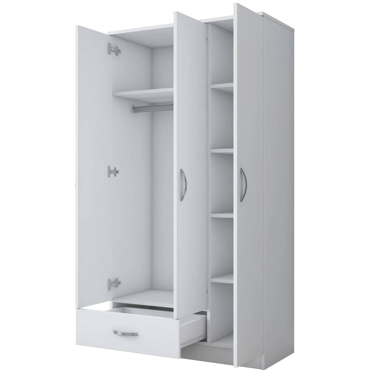 Stijlvolle en duurzame kledingkast gemaakt van 100% gemelamineerd spaanplaat. Voorzien van ruime legplanken, een lade en extra opbergruimte. Kan aan de muur worden bevestigd. Witte kleur