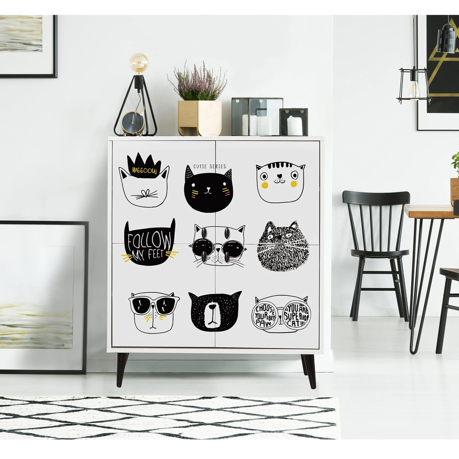 Vella multifunctionele kast biedt een stijlvolle en functionele opbergoplossing met melamine coating, haagbeuken poten, metalen en touw handgrepen en meerdere planken. Breedte: 95 cm, Hoogte: 111 cm, Diepte: 36 cm. Hoogte legplanken: 19. Verkrijgbaar in wit, zwart en geel.