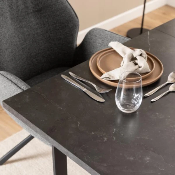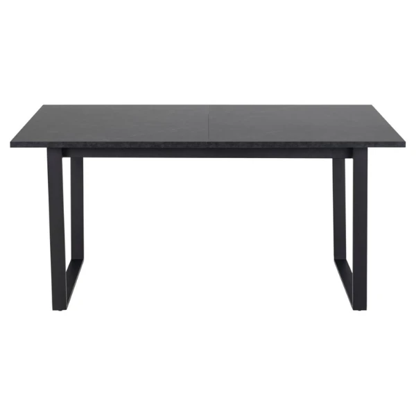 Eettafel Amanda 160x90x75cm met tafelblad in marmerlook en matzwarte metalen poten. Verlengbaar tot 220x90cm. Geschikt voor 4 tot 6 personen.