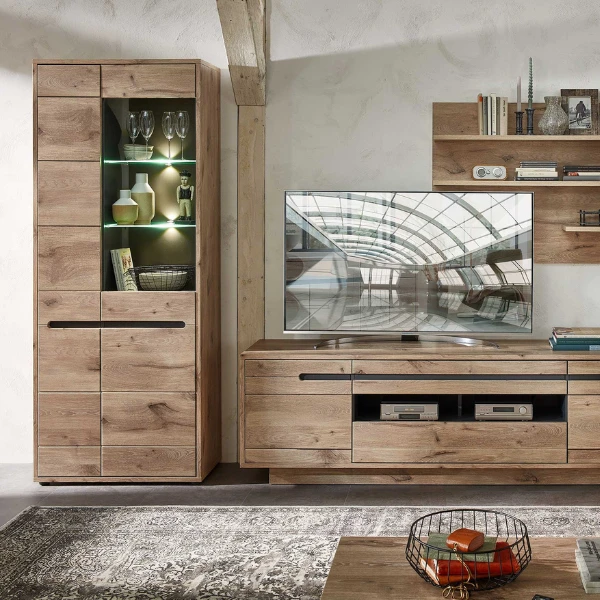 De collectie Bellini combineert een eigentijds ontwerp met een warme uitstraling dankzij de houtlook en antracietkleurige accenten. Deze vitrinekast is gemaakt uit spaanplaat en MDF en is afgewerkt met melamine in eiklook en antraciet. Achter de linkse deur zijn 5 legplanken voorzien. Achter de rechtse vitrinedeur vind je 4 legplanken, waarvan twee in glas. Zo heb je plaats om zowel spullen netjes uit het zicht op te bergen, als voor je mooiste boeken, decoratie en souvenirs. Dankzij de ingebouwde verlichting komt alles nog meer tot zijn recht. Ontdek de volledige collectie Bellini op onze website.Â