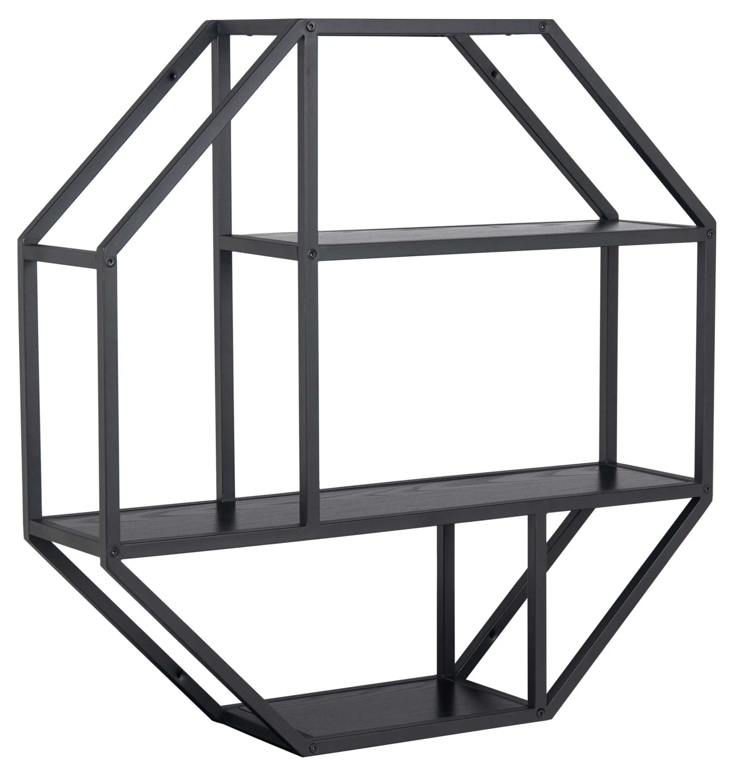 Wandrek Dover met geometrische vormen, gemaakt van matzwart metaal. Legplankjes in essenhout met een laagje melamine.