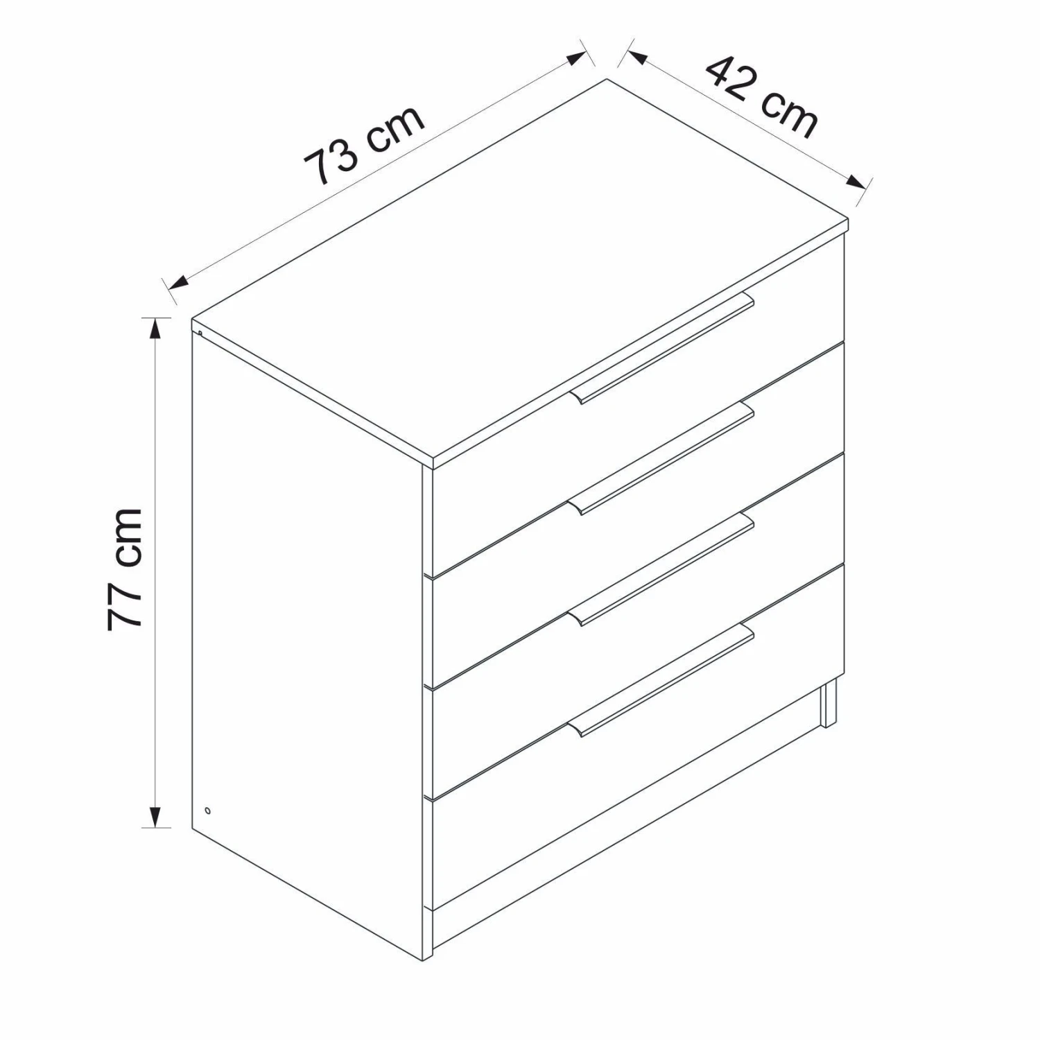 Met een dikte van 18 mm is dit dressoir bestand tegen dagelijks gebruik. De afmetingen van 73 cm in de breedte, 42 cm in de hoogte en 77 cm in de diepte maken het de perfecte maat om naadloos in elke ruimte te passen.
